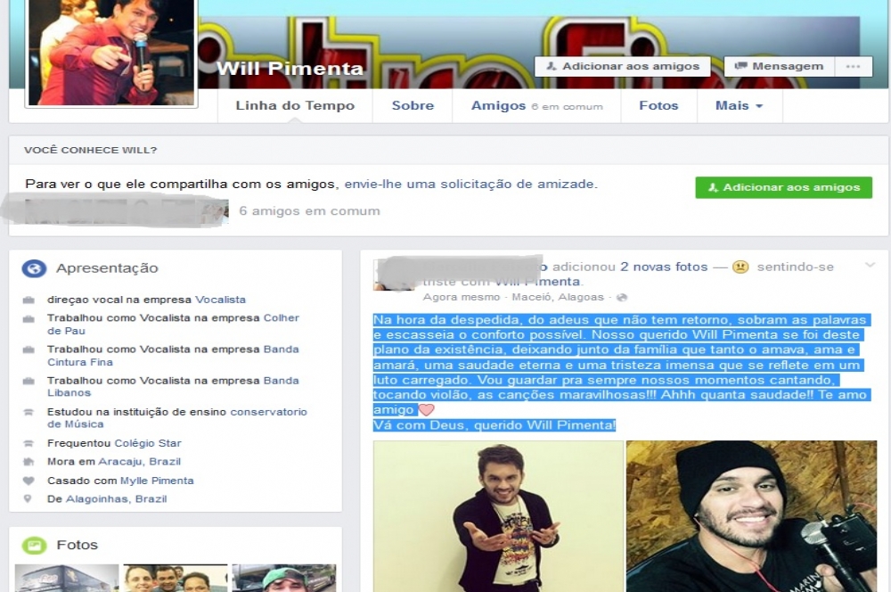escasseia o conforto possível. Nosso querido Will Pimenta se foi deste plano da existência, deixando junto da família que tanto o amava, ama e amará, uma saudade eterna e uma tristeza imensa que se reflete em um luto carregado. Vou guardar pra sempre nossos momentos cantando, tocando violão, as canções maravilhosas!!! Ahhh quanta saudade!! Te amo amigo. Vá com Deus, querido Will Pimenta", escreveu outra pessoa.