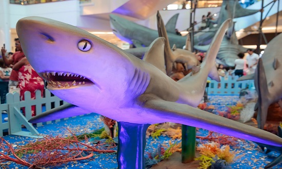O quê? Exposição reúne 25 réplicas de tubarões em tamanhos naturais, com sons e movimentos, e integra a programação Universo Marinho.