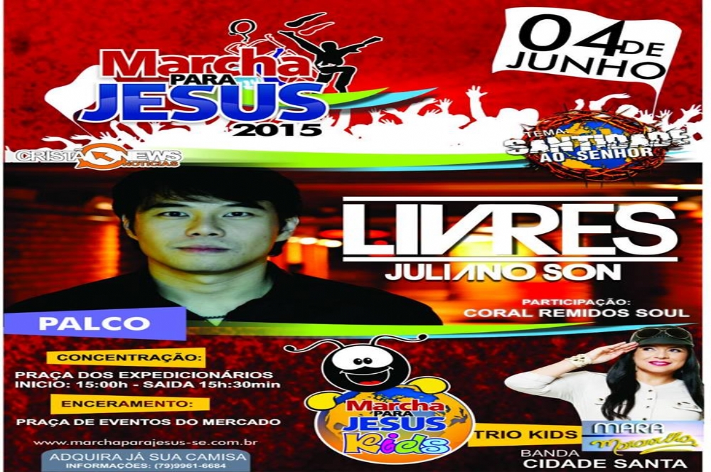 A Marcha para Jesus, tradicional evento que reúne várias denominações, será realizado no dia 4 de junho na capital sergipana. Este ano, o evento terá como atrações Livres com Juliano Son, além da participação do Coral Remidos Soul.