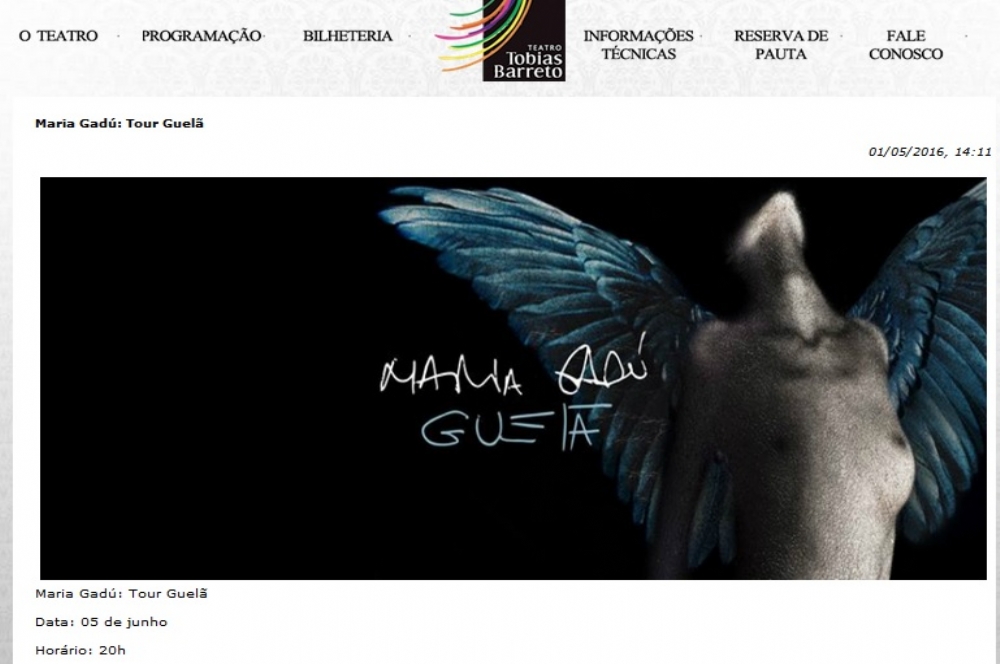 O Teatro Tobias Barreto receberá a cantora Maria Gadú com o Tour Guelã. O show será no dia 5 de junho, a partir das 20h, no Teatro Tobias Barreto.