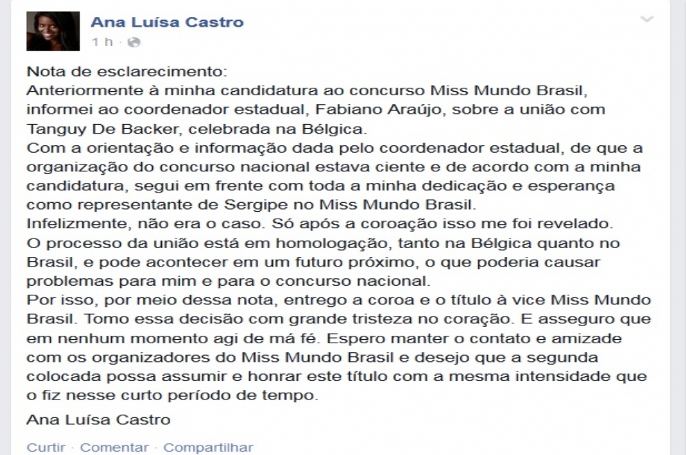 Em nota de esclarecimento, Ana Luísa, explica que havia informado ao coordenador estadual, Fabiano Araújo, sobre a união com Tanguy De Backer, celebrada na Bélgica. A miss acrescenta ainda que a informação dada pelo coordenador estadual foi de que a organização do concurso nacional estava ciente e de acordo com a candidatura.