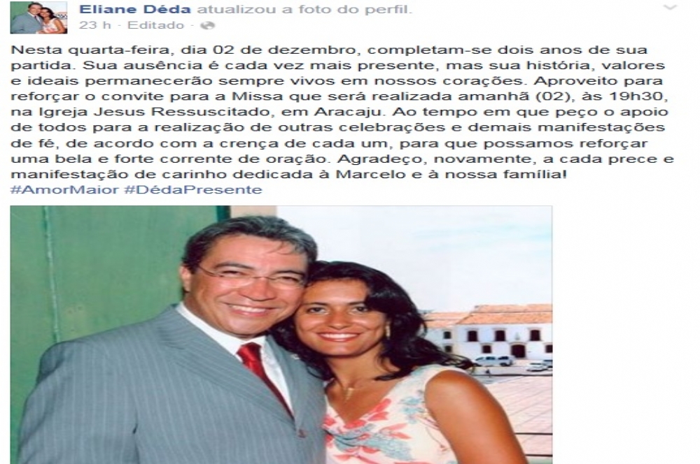 A presidente do Instituto Marcelo Déda, e ex-primeira dama de Sergipe, Eliane Aquino, fez uma homenagem nas redes sociais. “Nesta quarta-feira, dia 02 de dezembro, completam-se dois anos de sua partida. Sua ausência é cada vez mais presente, mas sua história, valores e ideais permanecerão sempre vivos em nossos corações”, escreveu na sua página no Facebook e pediu uma corrente de oração.
