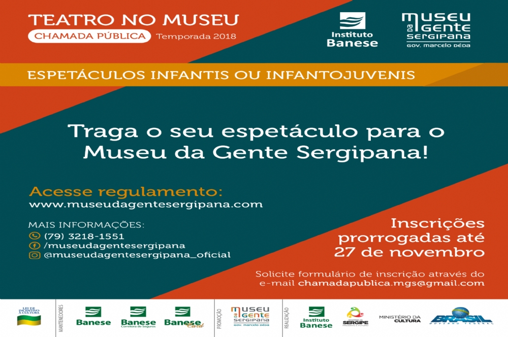 O Instituto Banese prorrogou até dia 27 de novembro as inscrições para seleção de propostas de espetáculos infantis e infantojuvenis para o átrio do Museu da Gente Sergipana Gov. Marcelo Déda. O objetivo é abrir espaço para projetos de artes cênicas (teatro, dança e circo) com espetáculos direcionados ao público infantil e infantojuvenil, visando fomentar a produção artística e a formação de plateia.