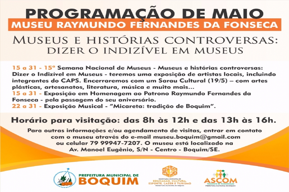A Prefeitura de Boquim, através do Departamento de Cultura preparou uma programação diversificada para o Museu Raymundo Fernandes da Fonseca neste mês de maio, que inclui exposições de artistas locais e sobre a cultura do povo boquinense, além de um sarau cultural com artes plásticas, artesanatos, literatura e boa música.