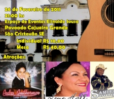 O evento reúne os cantores Samuel Sertanejo, Lene Hall e Pedro Guilherme, além da participação de um DJ. Os ingressos custam R$10 e a mesa para quatro pessoas R$40. Informações através do 079 9972-6705 ou ainda 9946-6110.