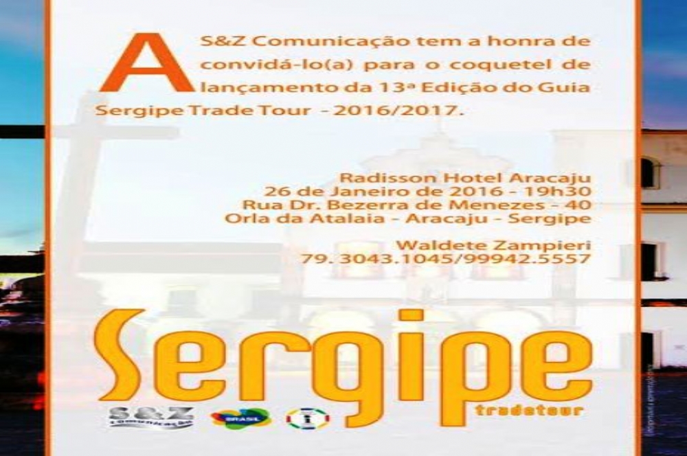 Será lançado no dia 26 de janeiro às 19h30 no Radisson Hotel Aracaju, em um evento somente para convidados, a 13 º Edição do Guia Sergipe Trade Tour – 2016/17, publicação da S&Z Comunicação. A obra destaca destinos de turismo sergipanos em português e em inglês e contará com 200 páginas, apresentando os roteiros turísticos de vários municípios de Sergipe e ainda o turismo rural, culinária regional e as manifestações culturais do estado.