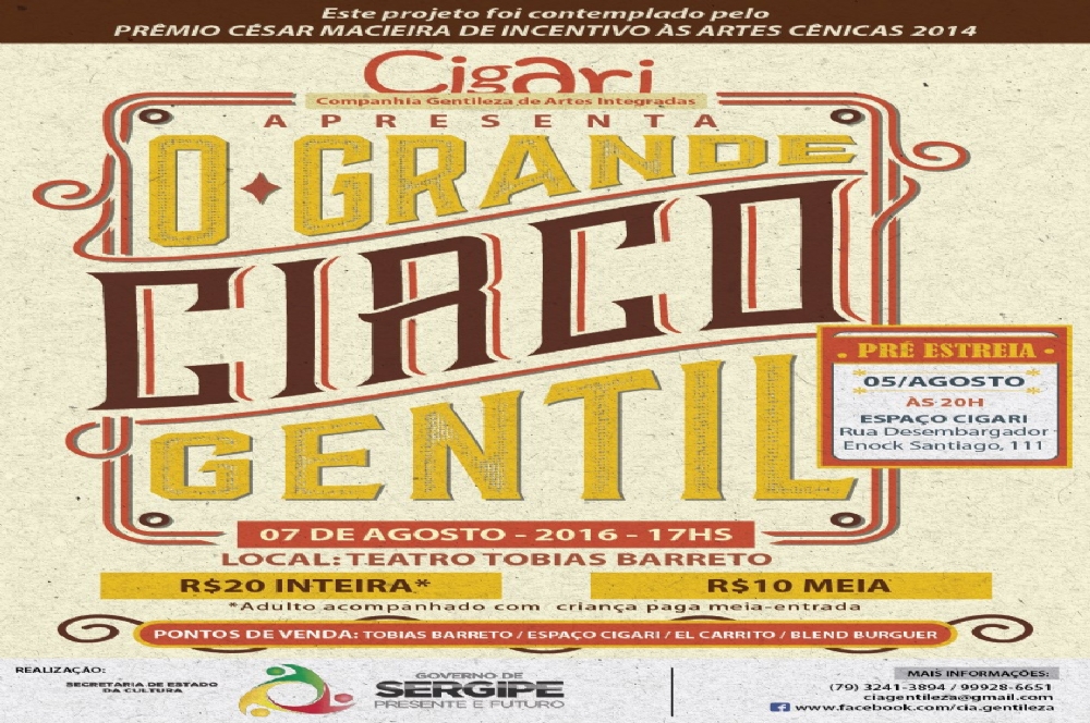 Um dos quatro espetáculos contemplados pelo Prêmio César Macieira de Artes Cênicas, da Secretaria de Estado da Cultura (Secult), “O Grande Circo Gentil”, se apresenta neste final de semana. Produzido pela Cia. Gentileza de Artes Integradas (Cigari), o espetáculo estreia nesta sexta, 05, no Espaço Cigari, com entrada franca, e domingo, 07, estará no Teatro Tobias Barreto.