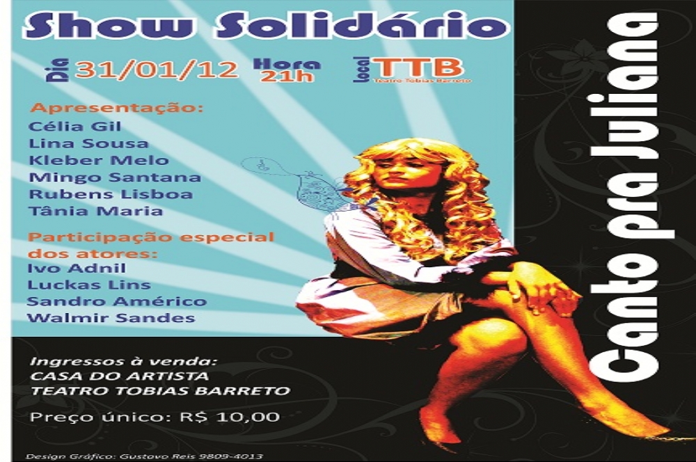 No dia 31 desse mês, às 21 horas, no Teatro Tobias Barreto, será realizado o show “Canto pra Juliana”, em intenção à jovem atriz sergipana Juliana Santos. O show de caráter solidário tem o objetivo de arrecadar o maior número em dinheiro para ajudar no tratamento de um câncer agressivo, o qual acometeu a supracitada atriz, aos 23 anos de idade.