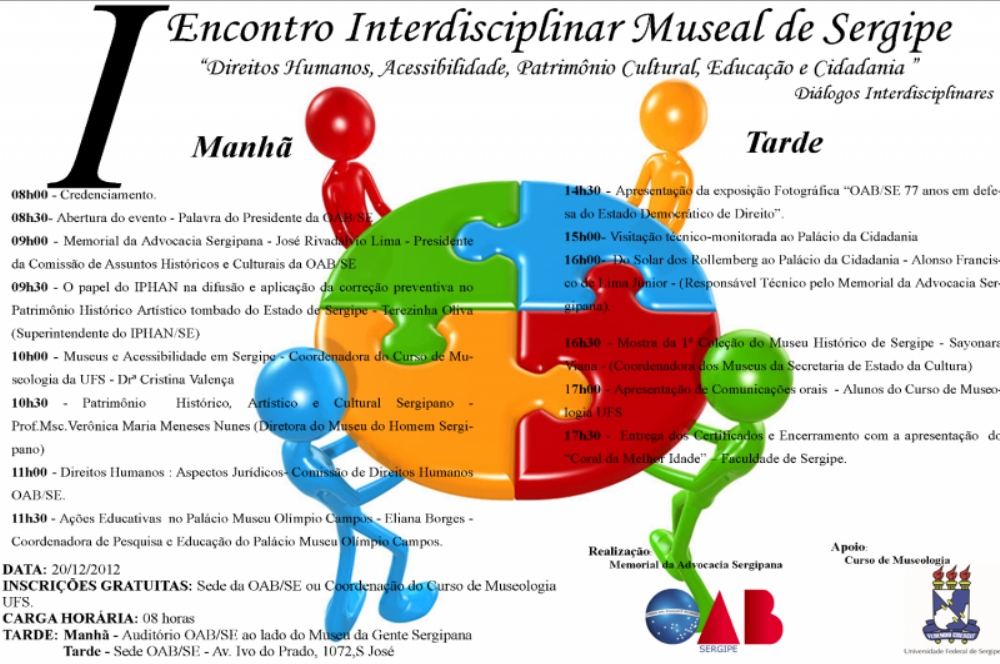 A Ordem dos Advogados do Brasil – Seccional Sergipe, por meio do Memorial da Advocacia Sergipana, promoverá o I Encontro Interdisciplinar Museal do Estado de Sergipe, no dia 20 de dezembro. O encontro será dividido em dois momentos, o primeiro das 08h às 12h, no Auditório da OAB/SE, localizado na Caixa de Assistência dos Advogados (CAA/SE), na Travessa Martinho Garcez. Já o segundo momento será das 14h às 18h no Palácio da Cidadania, atual sede da OAB Sergipe, localizado à Avenida Ivo do Prado, 1072.