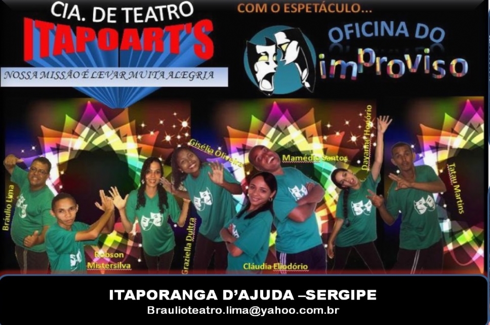 O espetáculo Oficina do Improviso é encenado neste final de semana, em Aracaju, pelo grupo teatral da cidade de Itaporanga D’Ajuda, o Itapoart’s e dirigido por Bráulio Lima. As apresentações serão realizadas no Teatro Lourival Baptista, nos próximos dias 10 e 11 de abril (sexta e sábado). Os ingressos tem valor de R$10,00 (inteira) e R$5,00 (meia). Maiores informações por meio do telefone (79) 31791970.