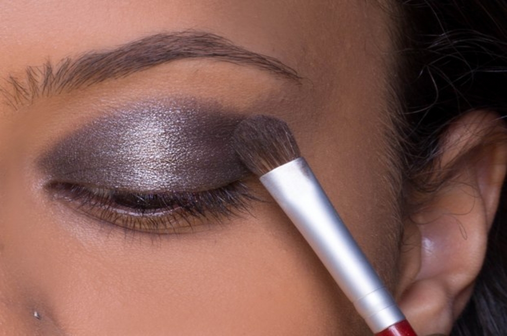 2 – Com o pincel aplicador de sombra umedecido em água, aplique a sombra escolhida em toda a pálpebra móvel até a altura do côncavo.