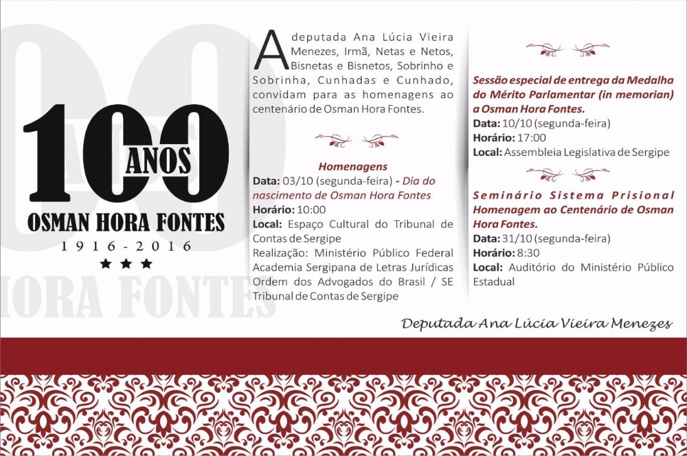 O jurista e intelectual sergipano Osman Hora Fontes receberá diversas homenagens póstumas pela passagem do seu centenário. A programação inclui exposição fotográfica, lançamento de um documentário sobre sua vida, entrega de Medalha do Mérito Parlamentar e relançamento do livro “Quatro encontros com a mocidade”, de sua autoria. Osman foi advogado, Procurador Geral da República em Sergipe por 37 anos, professor e um dos fundadores da Faculdade de Direito de Sergipe, que deu origem ao curso de Direito da Universidade Federal de Sergipe.