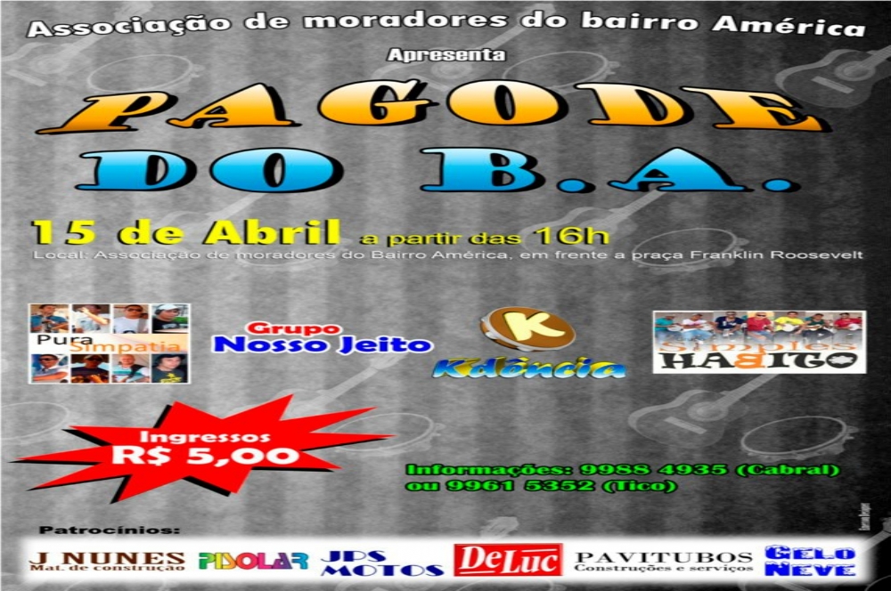 Neste domingo,15, a partir das 16h acontece na Associação dos Moradores do bairro América, localizada em frente a Praça Franklin Roosevelt, o Pagode do B.A. O evento reúne os grupos Pura Simpatia, Nosso Jeito, Kdência e Simples Hábito.