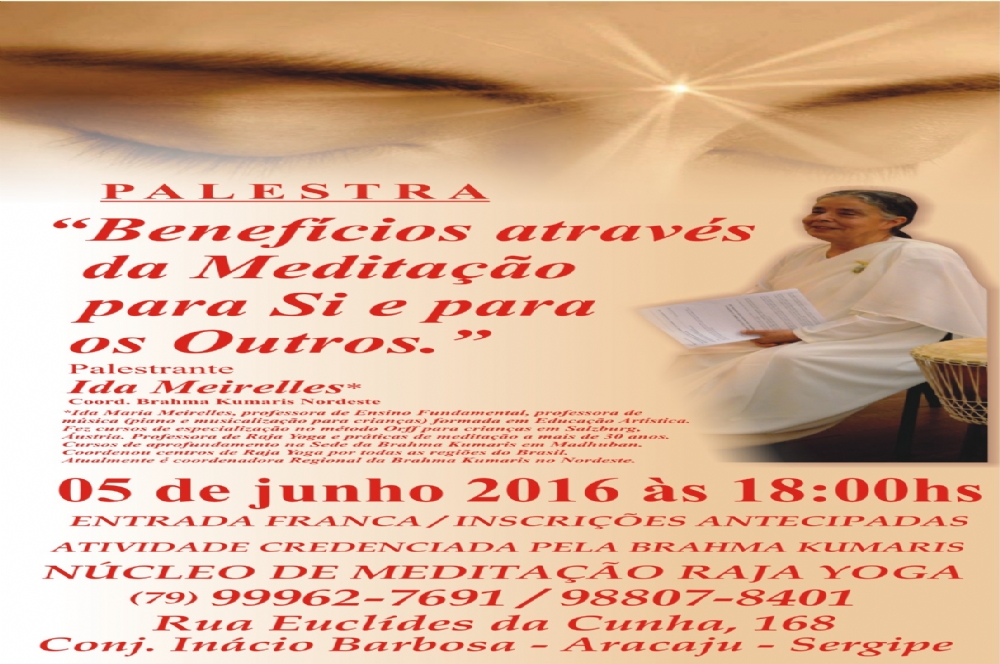 No dia 5 de junho às 18h ocorrerá a palestra "Benefícios através da Meditação para si e para os outros". A palestra será ministrada por Ida Meirelles que é coordenadora da Brahma Kumaris Nordeste com sede em Salvador.