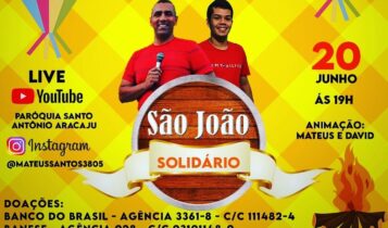 A paróquia Santo Antônio vai realizar no próximo sábado, 20, uma live solidária. Com a participação dos cantores Mateus Santos e David Melo, a transmissão terá temática junina. O objetivo é arrecadar alimentos, produtos de higiene e limpeza ou contribuições em dinheiro para comunidades carentes que enfrentam maiores necessidades neste momento. A live começará às 19h e será transmitida no canal do Youtube: “Paróquia Santo Antônio Aracaju”.