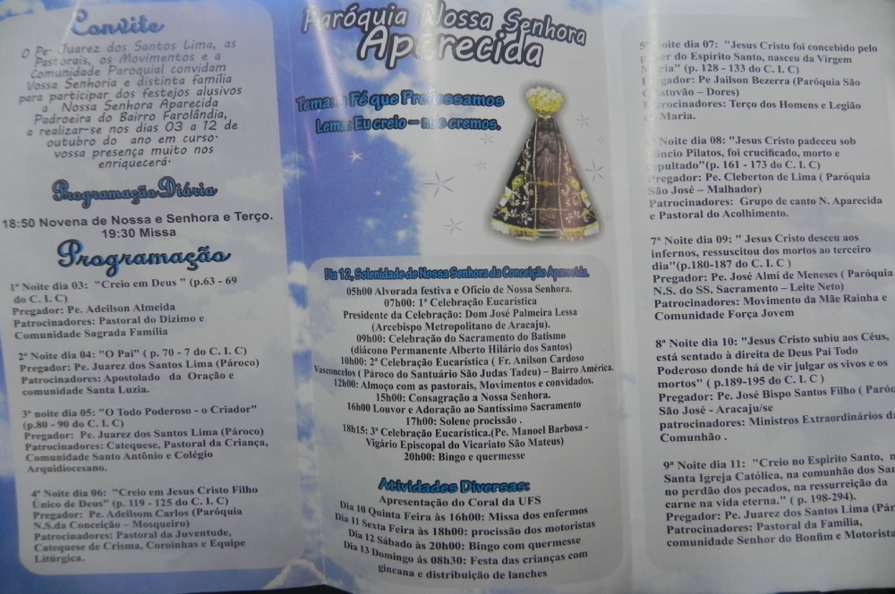 | Programação da novena de Nossa Senhora Aparecida na Farolândia |