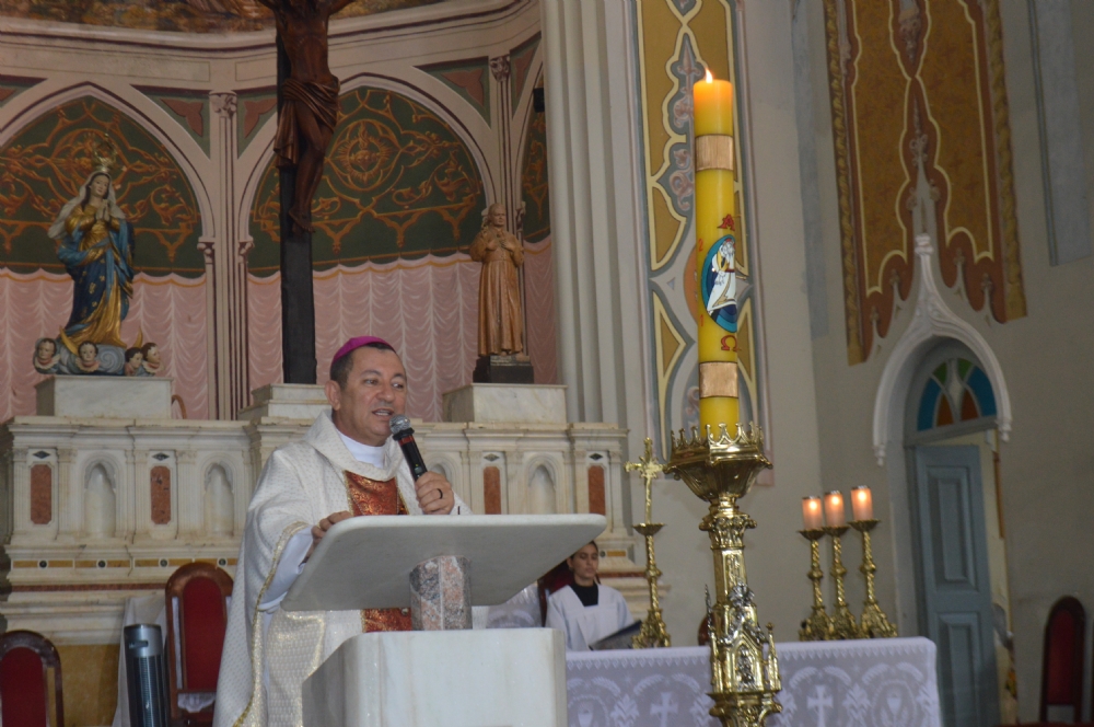 Na homilia [pregação em estilo familiar que busca explicar um tema ou texto evangélico], o bispo Dom João José da Costa, que substutui D. Lessa [está se aposentando], destacou para os fiéis, a importância de saber que Cristo venceu e permanece vivo entre as pessoas.