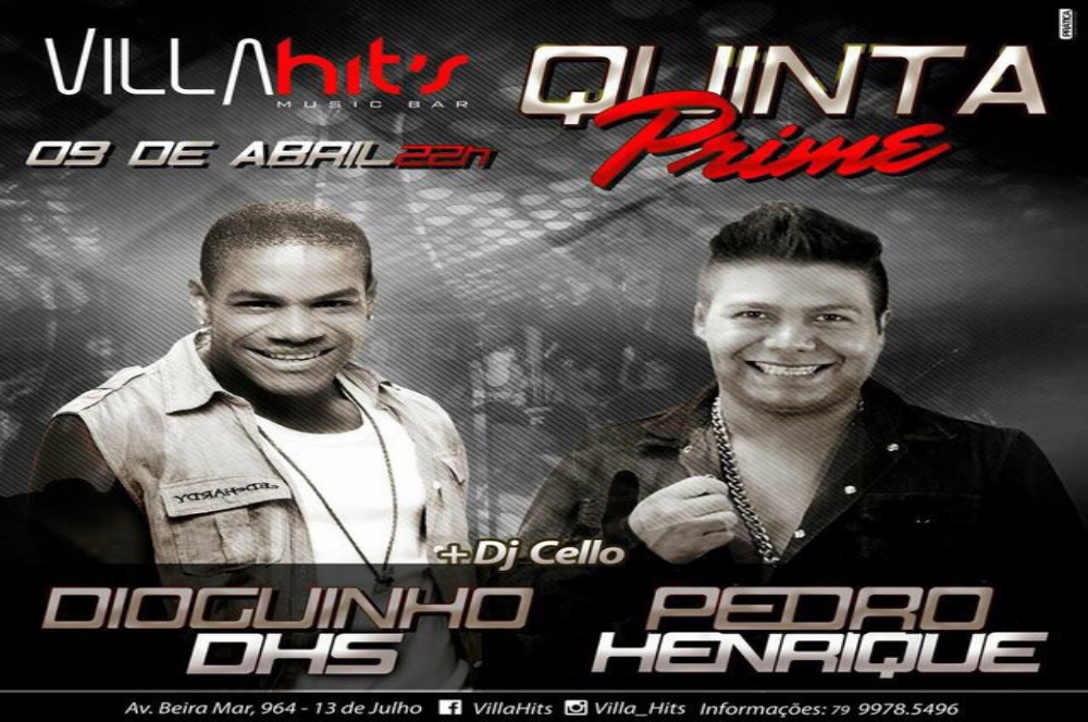 Esta semana acontece mais uma edição da ‘Quinta Prime’ no Villa Hits Music Bar. Na quinta-feira,9, Dioguinho DHS e Pedro Henrique sobem ao palco da mais nova casa de show sergipana com muito pagode e sertanejo para a galera.