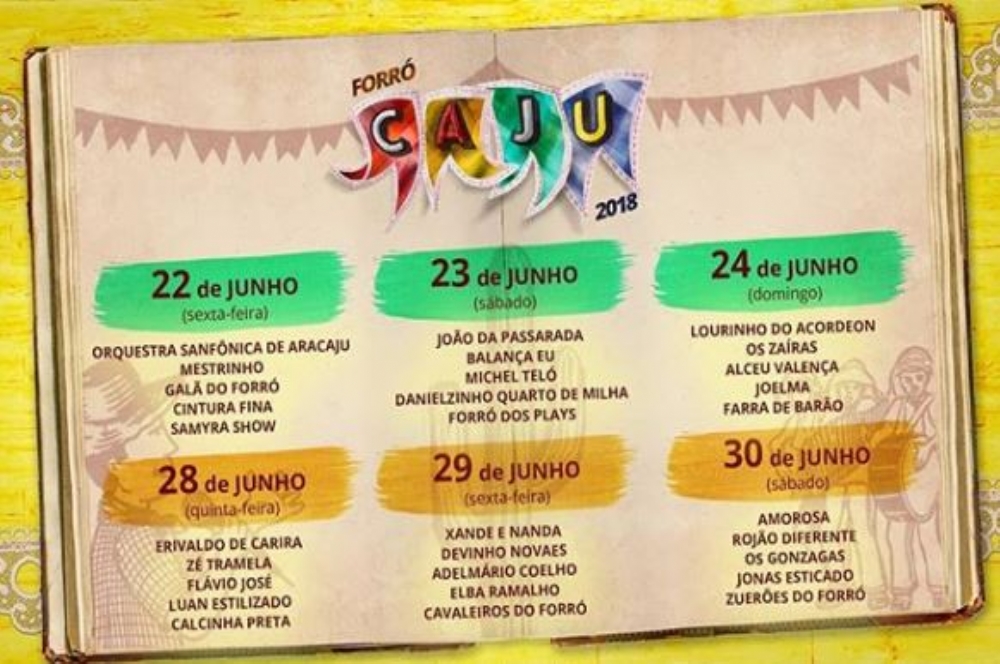 O prefeito Edvaldo Nogueira anunciou na noite desta sexta-feira, 25, a programação completa do Forró Caju 2018. A festa acontecerá na praça de eventos Hilton Lopes, entre os mercados centrais, nos dias 22, 23, 24, 28, 29 e 30 de junho. Além da festa na praça entre os Mercados Centrais, a capital sergipana contará com festas em alguns bairros.
