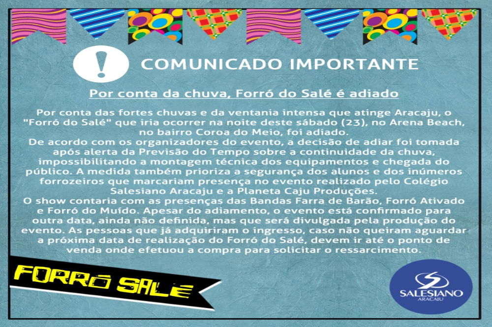 De acordo com os organizadores do evento, a decisão de adiar foi tomada após alerta da Previsão do Tempo sobre a continuidade da chuva, impossibilitando a montagem técnica dos equipamentos e chegada do público. A medida também prioriza a segurança dos alunos e dos inúmeros forrozeiros que marcariam presença no evento realizado pelo Colégio Salesiano Aracaju e a Planeta Caju Produções.
