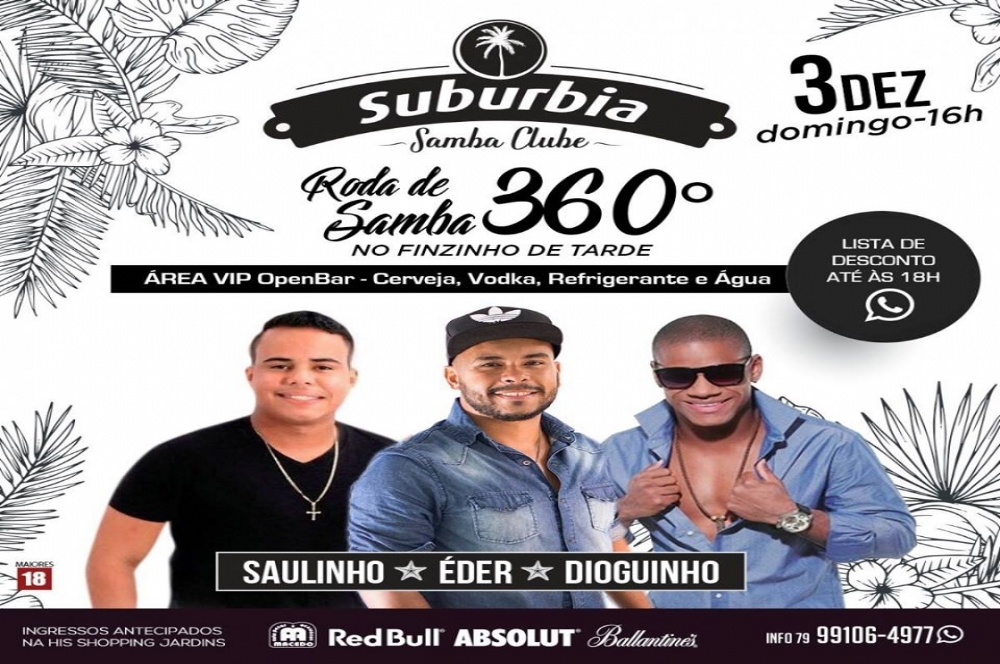 Final de tarde do domingo combina com um bom samba e foi por isso que foi idealizado o 'Suburbia Samba Clube', novo projeto da casa de eventos que estreia neste domingo, 3 de dezembro, a partir das 16 horas. E nesta primeira edição, as atrações serão Saulinho, Éder e Dioguinho na roda de samba 360 graus.