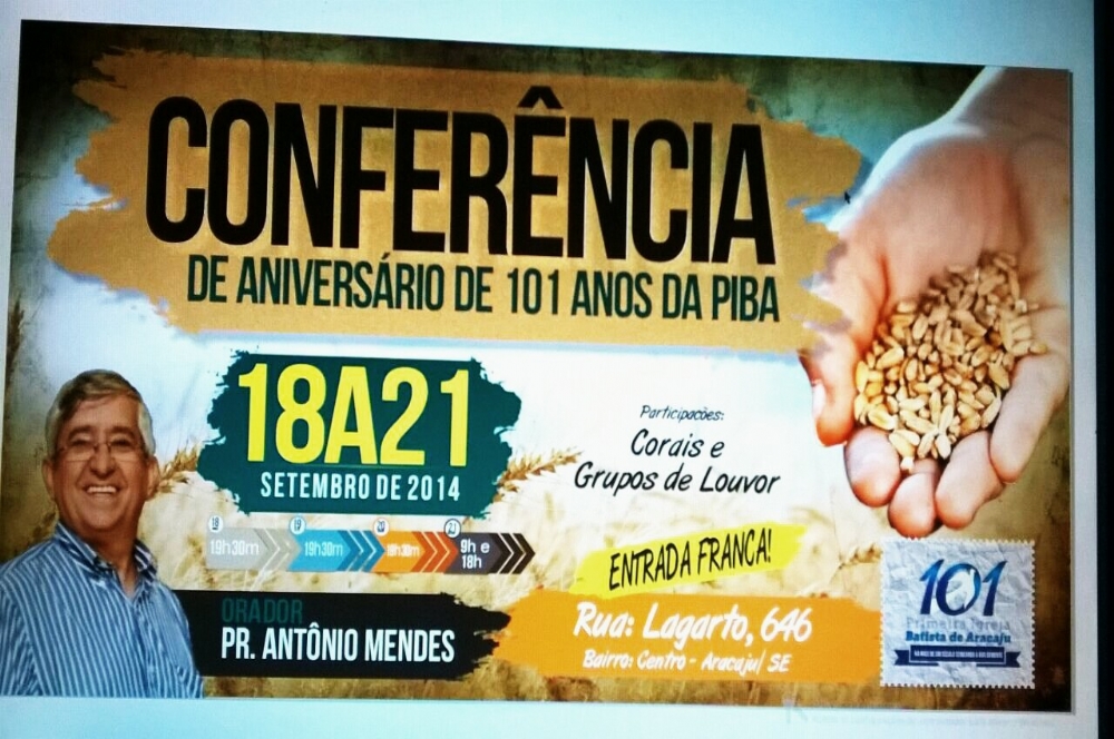 A Primeira Igreja Batista de Aracaju (Piba) faz nesta sexta-feira, 19 de setembro, aniversário de 101 anos de fundação. Para celebrar os feitos significativos da igreja centenária em Sergipe, será realizada mais uma Conferência Evangelística. O evento ocorrerá na Sede da Piba, localizada na rua Lagarto, 646, Centro, nos dias 18, 19 e 20, às 19h30, e no domingo, 21 de setembro, em dois horários: manhã às 9h e noite às 18h. O evento é gratuito e todos podem comparecer.