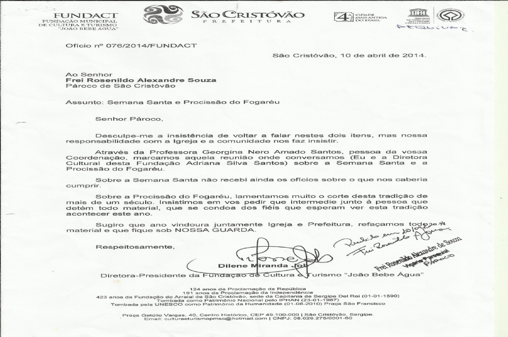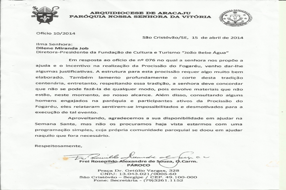 A reportagem do Portal Infonet procurou a prefeita de São Cristóvão, Rivanda Batalha, que afirmou que a decisão não possui ligação política ou religiosa. “O que houve foi que a pessoa que detém as fantasias decidiu que não iria emprestar as roupas aos homens que participavam da procissão. Daí a prefeitura, que reafirmou o seu compromisso em dar toda a estrutura ao evento, tentou por diversas vezes, por meio da Secretaria de Cultura, negociar, mas não houve avanço. A igreja decidiu em não realizar o evento. Ficamos muito tristes, porque é um evento de tradição”.
