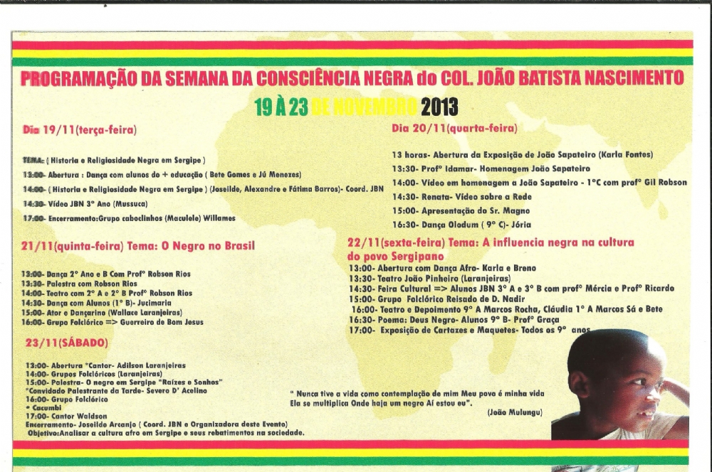 Na última quarta-feira, 21, foi lembrado o Dia da Consciência Negra em todo o Brasil. Para destacar a de luta dos afrodescendentes, a professora Joseilde Arcanjo, do Colégio Estadual João Batista Nascimento, em Nossa Senhora do Socorro, organizou uma vasta programação que se encerra neste sábado, 23.