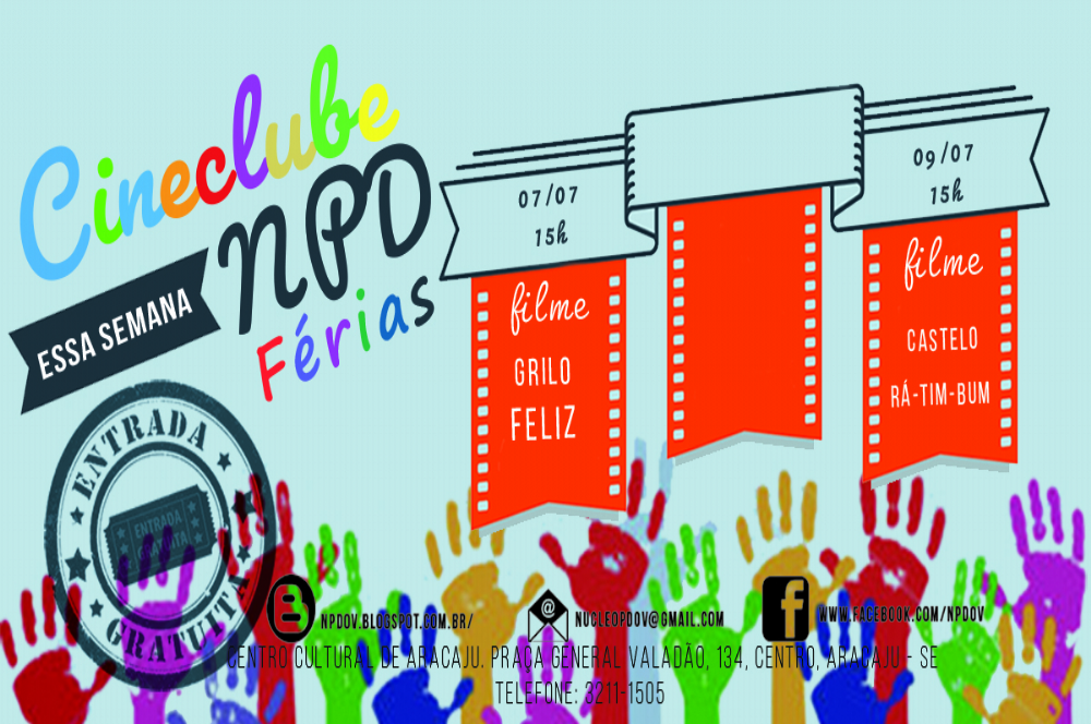 Próxima semana o Cineclube NPDOV estará com uma programação especial de férias com dois filmes direcionados para o público infantil. Na terça-feira dia 7 de julho às 15 horas exibiremos a animação O Grilo Feliz e na quinta-feira dia 9 de julho no mesmo horário o filme Castelo Rá-Tim-bum. As exibições são sempre gratuitas e o público ainda pode aproveitar para conhecer o Centro Cultural de Aracaju que tem exposições, biblioteca, teatro, sala da cultura popular. Centro Cultural de Aracaju (antiga Alfândega), praça General Valadão, 134 – Centro.