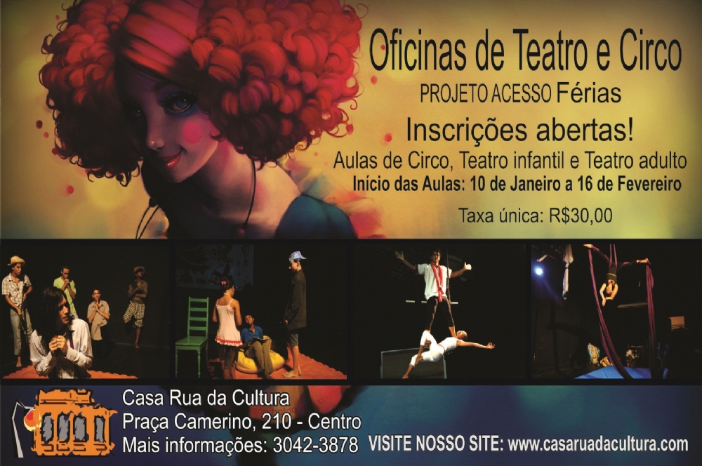 Para quem ainda não teve a oportunidade de participar das oficinas regulares de teatro e de circo, agora poderá participar das atividades desenvolvidas pela Casa Rua da Cultura. As inscrições acontecem na Casa Rua da Cultura que fica na Praça Camerino, 210, no Centro. Para mais informações: 3042-3878 ou visite o site.