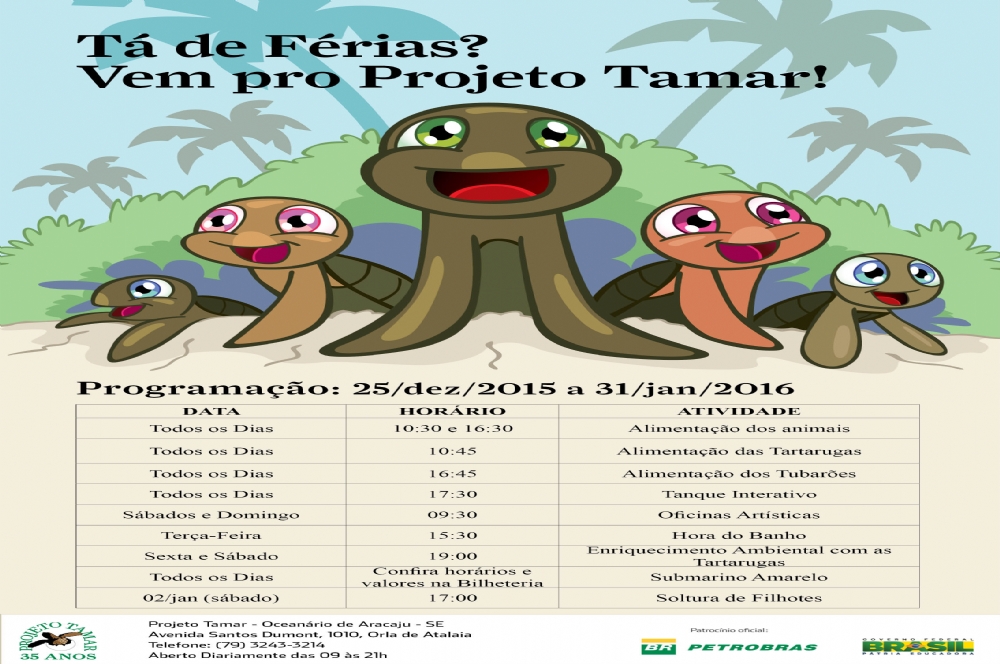 O Projeto Tamar realizará neste sábado, 2, a primeira soltura de filhotes de tartarugas marinhas de 2016. O evento acontece às 17h na Orla de Atalaia. O Oceanário de Aracaju foi inaugurado em 2002 e tem por objetivo a preservação da vida marinha e das tartarugas.