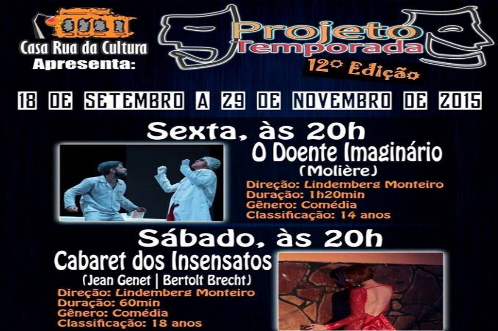 No dia 18 de setembro, a Casa Rua da Cultura vai iniciar o Projeto Temporada. Esta é a 12ª edição do projeto, que vai até o dia 29 de novembro com espetáculos todas as sextas e sábados. Ingressos por R$ 20 (inteira) e R$ 10 (meia).