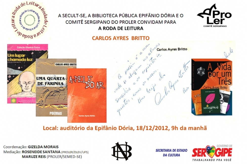 O Comitê Sergipano do PROLER (FBN), realizará na Biblioteca Epifânio Dória a última Roda de Leitura do ano. O evento será no dia 18 às 9h e terá como enfoque a poesia de Carlos Ayres Britto. A entrada é franca e os professores podem fazer reserva de vagas para os seus alunos pelos telefones 3179-1907 e 3179-1935.