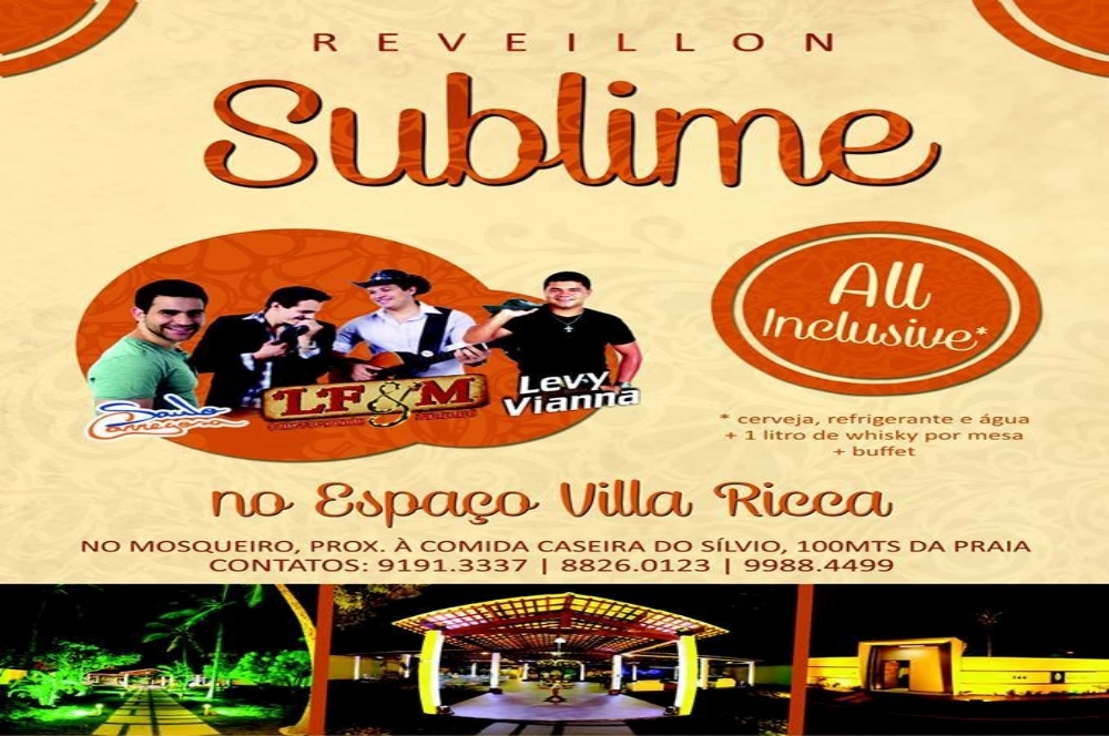 No próximo dia 31, o Espaço Villa Ricca será palco para o ‘Reveillon Sublime’, realizado no Espaço Villa Ricca, no Mosqueiro. O evento vai contar com All Inclusive com buffet, refrigerante, cerveja, água e um litro de whisky em cada mesa. Quem anima a noite é a dupla Luís Fernando e Manuel, o cantor baiano Saulo Carregosa e Levy Viana. Mesa para quatro pessoas no valor estão à venda por R$ 800 e R$ 180 individual.
