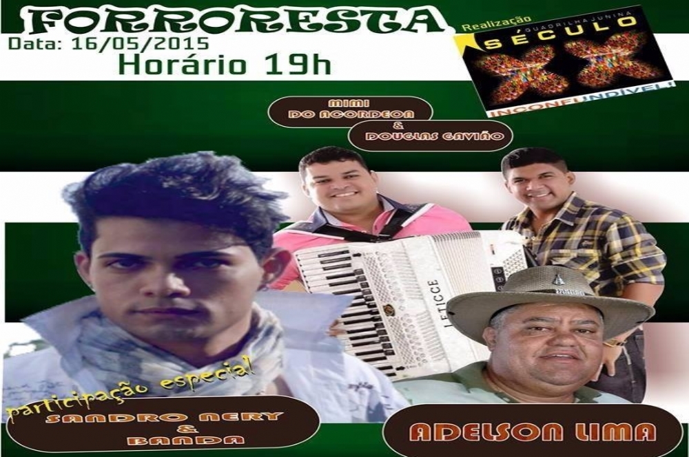 A Quadrilha “Século XX” realiza no dia 16 de maio, a 1ª edição da Forroresta. O evento, que será uma mistura de forró e seresta, contará com as apresentações de Sandro Nery, Mimi do Acordeon, Douglas Gavião e Adelson Lima. O objetivo é arrecadar fundos para a aquisição das indumentárias dos integrantes da quadrilha.