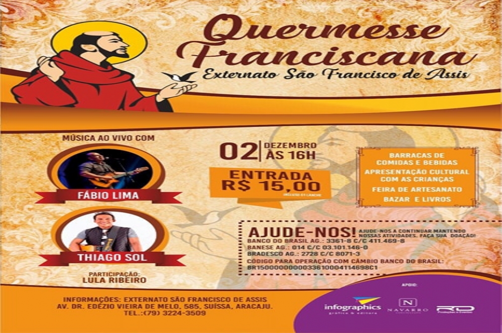 A Quermesse Franciscana será realizada a partir das 16h deste sábado, 2, no Externato São Francisco de Assis, localizado na Avenida Edésio Vieira de Melo, 585, no Bairro Suissa em Aracaju. A festa que promete ser bem animada vai contar com shows de Thiago Sol e Fábio Lima com a participação de Lula Ribeiro.