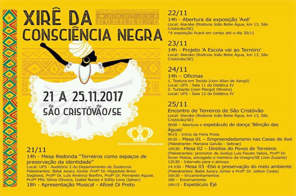 Para abrir a programação, será realizada, nesta terça-feira (21), a partir das 14h, no auditório do Departamento de Zootecnia da Universidade Federal de Sergipe (UFS), uma Mesa Redonda sobre “Terreiros como Espaços de preservação da identidade". O Xirê segue até o sábado (25), quando acontece o Encontro de Terreiros de São Cristóvão, no Ilé Asé Alaroke, localizado na Rodovia João Bebe Água, com palestras sobre afroempreendedorismo, direitos dos povos de terreiros e a preservação do meio ambiente. Especialistas no assunto explicarão como fortalecer a geração de renda dentro dos terreiros, quais as leis que protegem os locais de culto e como criar alternativas para a prática de oferendas sem poluir a natureza.