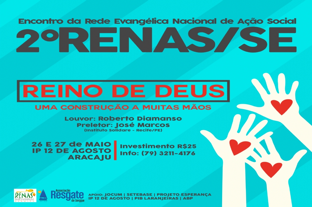 A Rede Nacional Evangélica de Ação Social (Renas) realiza no mês de maio o 2º encontro estadual em Sergipe. Este ano, a programação será conduzida pelo tema “Reino de Deus: uma construção a muitas mãos” com a ideia de criar espaços para parcerias estratégicas e a troca de experiências sobre as ações sociais que já são realizadas pelos cristãos sergipanos.