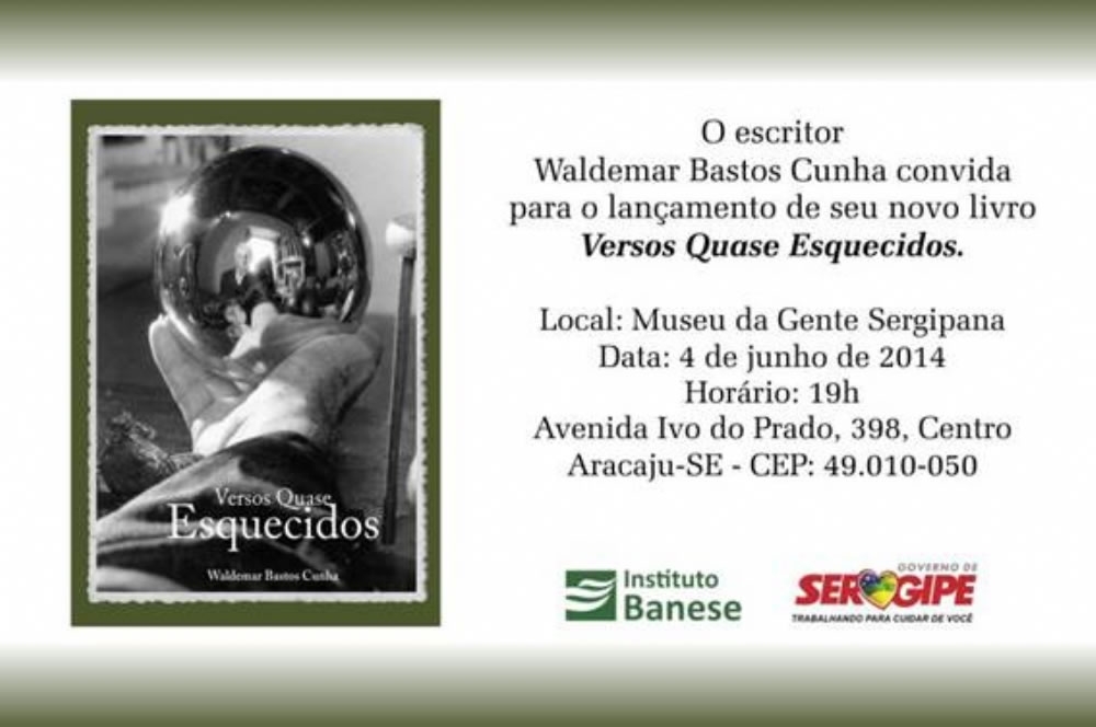 O advogado e escritor Waldemar Bastos Cunha lançará nesta quarta-feira, 4 de junho, às 19h, no Museu da Gente Sergipana, seu livro de poesia denominado “Versos Quase Esquecidos”. O lançamento tem o apoio do Instituto Banese e do Governo do Estado de Sergipe e toda a renda arrecadada com o livro será destinada à cantora Clemilda.