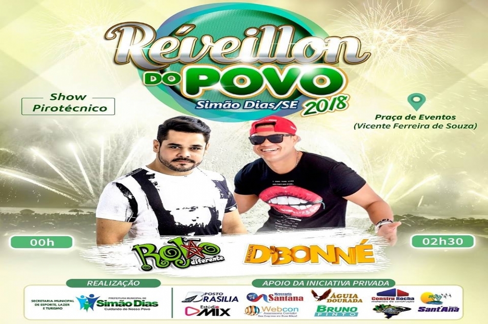 A chegada de 2018 em Simão Dias será animada pelas bandas Rojão Diferente e D’Bonné. O evento acontece na Praça de Eventos Vicente Ferreira de Souza. As festividades começam a partir de 0h, com show pirotécnico e logo em seguida, os shows artísticos. A entrada é gratuita.