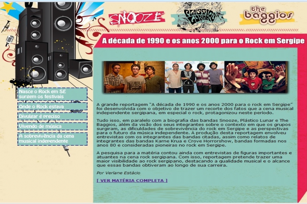 Um olhar atento à trajetória percorrida pelo rock sergipano resultou em uma grande reportagem denominada “A década de 1990 e os anos 2000 para o rock em Sergipe”. Uma espécie de recorte dos fatos sob a visão de três bandas que emergiram neste período: Snooze (indie rock), Plástico Lunar (mistura de rock e psicodelia musical) e The Baggios (blues rock). Tudo isso em um hot site dinâmico que traz à tona as histórias dessas bandas, acompanhadas das opiniões de seus integrantes sobre o contexto no qual surgiram, além das dificuldades de sobrevivência do rock em Sergipe e as perspectivas para o futuro da música independente.