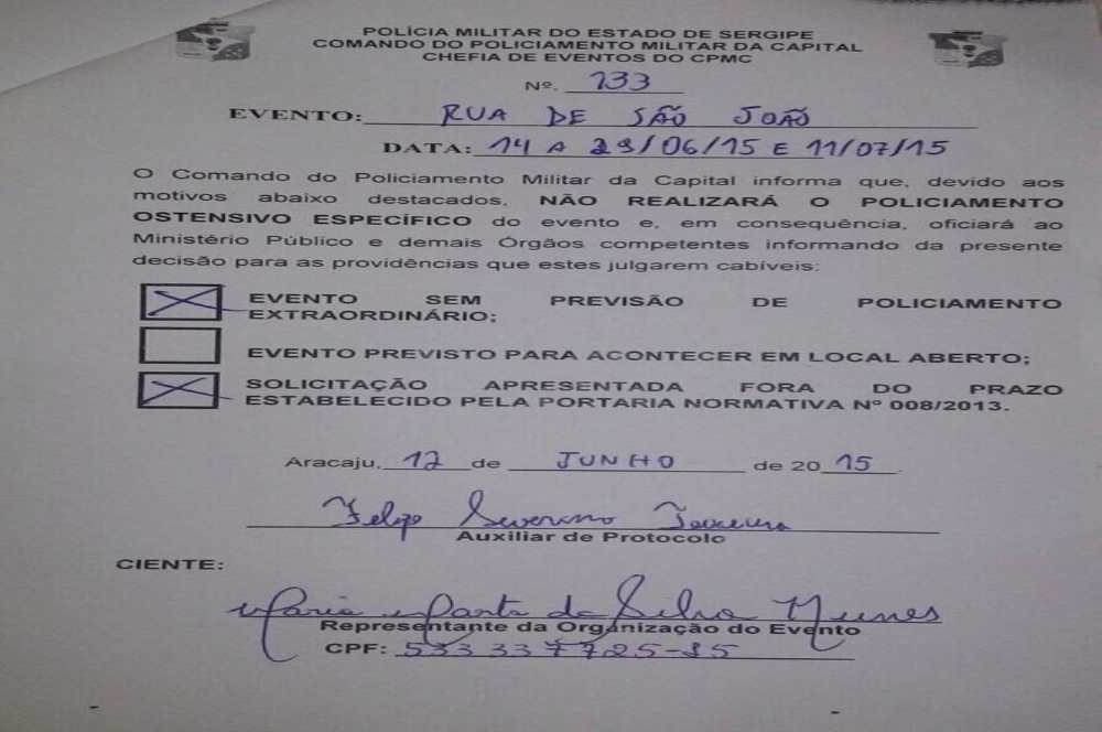 Os organizadores alegam que enviaram um ofício à Polícia Militar, que teria se negado a disponibilizar policiais para garantir a segurança da festa. Já o comandante da Polícia Militar, Maurício Iunes, explica que a solicitação não foi feita dentro do prazo estabelecido.
