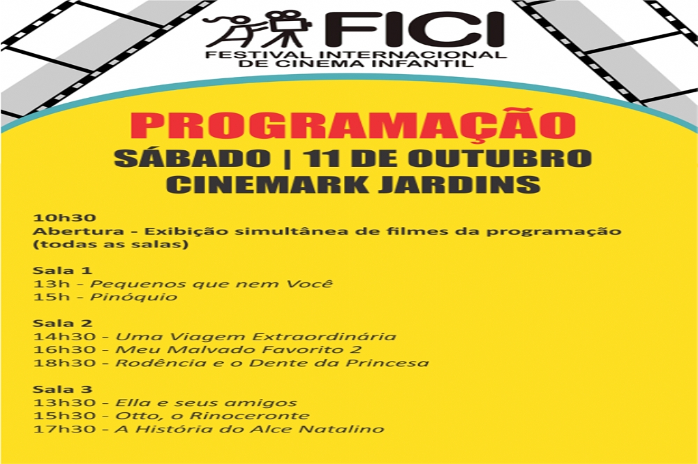 Um sábado,11, especial para as crianças. Com programação que vai de cinema a esportes. Hoje, às 10h30 tem a abertura do Festival Internacional de Cinema Infantil (FICI) no Cinemark Jardins. Uma festa com sessões simultâneas em nove salas do cinema, além de oficinas, palhaços pernas de pau e muita alegria. À tarde, o Cinemark Jardins, onde toda a programação do Festival acontece, continua a exibir filmes sensacionais com meia-entrada (R$ 7) para todos. O FICI ocorre até o dia 19 de outubro com sessões abertas ao público geral às sextas, sábados e domingos. Confira a programação.
