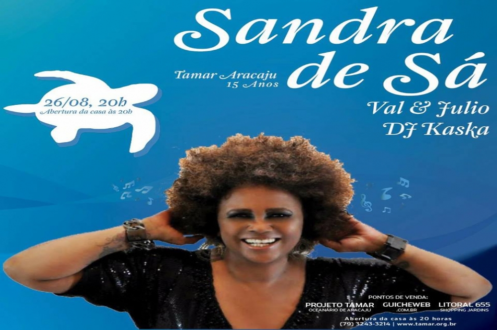 Seguindo as diversas comemorações em 2017 de 15 anos do Projeto TAMAR em Aracaju/SE, dia 26, a partir das 20 horas, Sandra de Sá traz todo o seu carisma e talento para celebrar conosco a conservação das tartarugas marinhas.