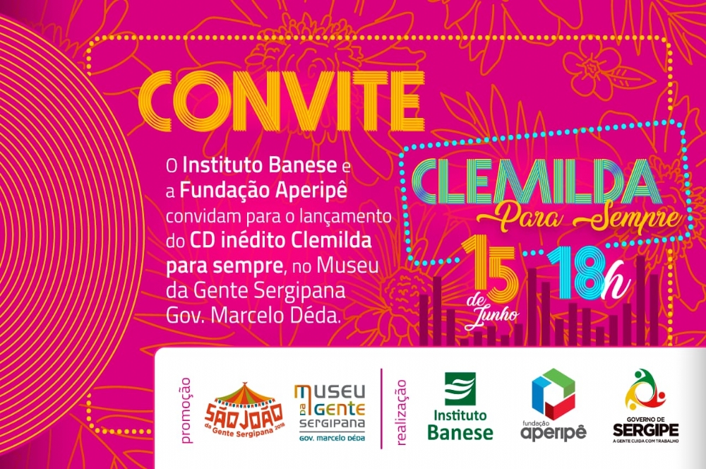Nos próximos dias 14 e 15 de junho, o Instituto Banese, através do Museu da Gente Sergipana Gov. Marcelo Déda, realizará o São João da Gente Sergipana. Esse ano, com a parceria da Fundação Aperipê, a cantora Clemilda será homenageada através do lançamento do CD inédito ‘Clemilda Para Sempre’, composto por 14 músicas que a cantora compôs antes de falecer. A programação é gratuita e o CD poderá ser adquirido durante o evento mediante a doação de um quilo de alimento não perecível.