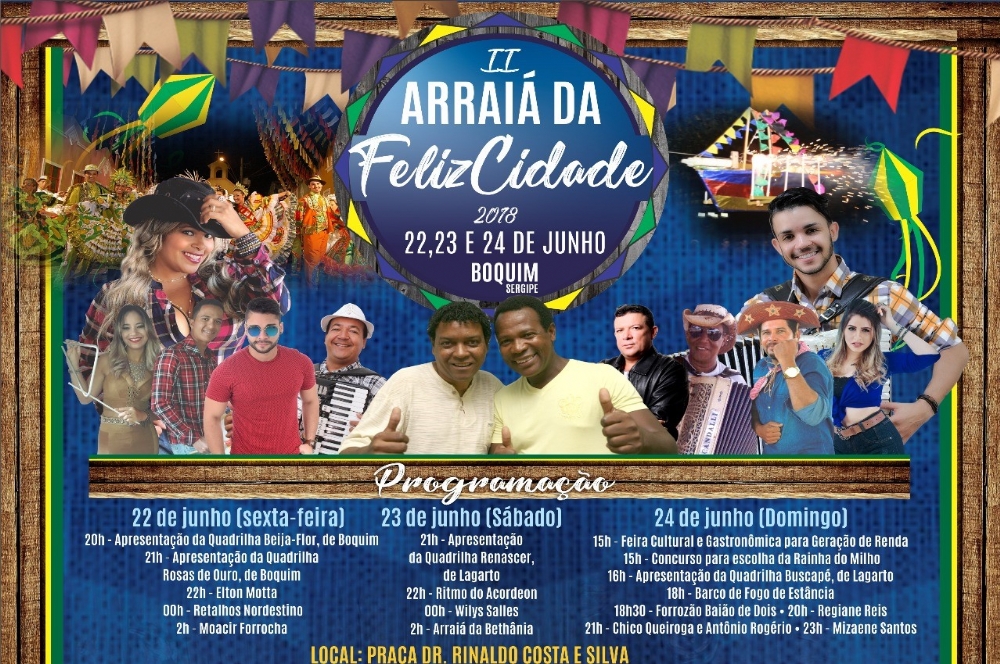 Em clima de Copa do Mundo os festejos juninos prometem movimentar Boquim nos próximos dias 22, 23 e 24 de junho, quando a Prefeitura monta o grande Arraiá da Feliz Cidade, na Praça Dr. Rinaldo Costa e Silva, a Praça do G Barbosa, enchendo a cidade de cor, alegria e fomentando o comércio local.