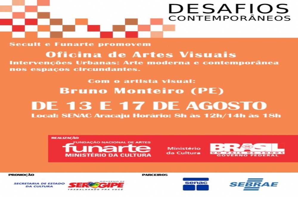 Entre os dias 13 e 17 de agosto Aracaju receberá a oficina “Intervenções Urbanas: Arte moderna e contemporânea nos espaços circundantes”, que será ministrada pelo artista visual pernambucano, Bruno Monteiro.