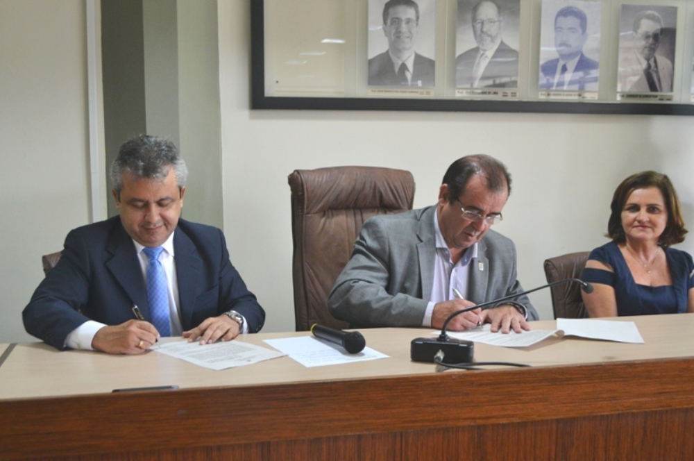 | Secretário Elber Batalha e o reitor Angelo Antoniolli assinam acordo (Foto: Secult) |