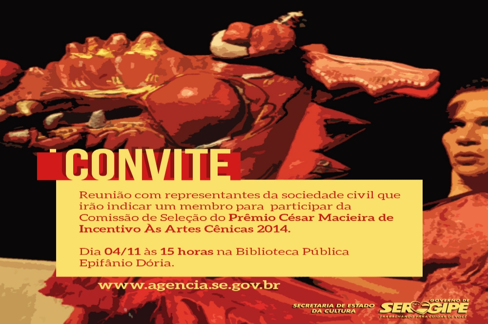 A Secretaria de Estado da Cultura (Secult) convida membros da sociedade civil para a escolha de representante que deverá integrar a comissão de seleção do Prêmio César Macieira de Incentivo às Artes Cênicas de 2014. A reunião acontece às 15h do dia 4 de novembro, na Biblioteca Pública Epifânio Dória, em Aracaju.