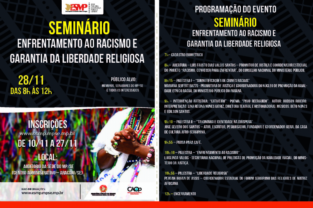 Com o intuito de contribuir para máxima eficácia da atuação do Ministério Público Brasileiro no enfrentamento ao racismo e na garantia da liberdade religiosa, através da formação e qualificação dos seus Membros e Servidores, a Escola Superior do Ministério Público de Sergipe, o Centro de Apoio Operacional dos Direitos Humanos e a Coordenação Estadual do Projeto “Racismo: Conhecer para Enfrentar, do Conselho Nacional do Ministério Público”, realizarão o Seminário Enfrentamento ao Racismo e Garantia da Liberdade Religiosa.